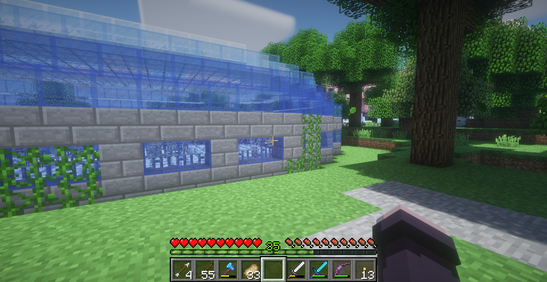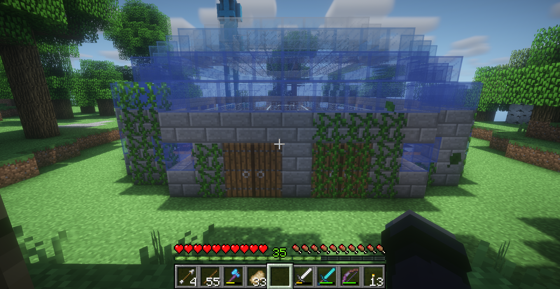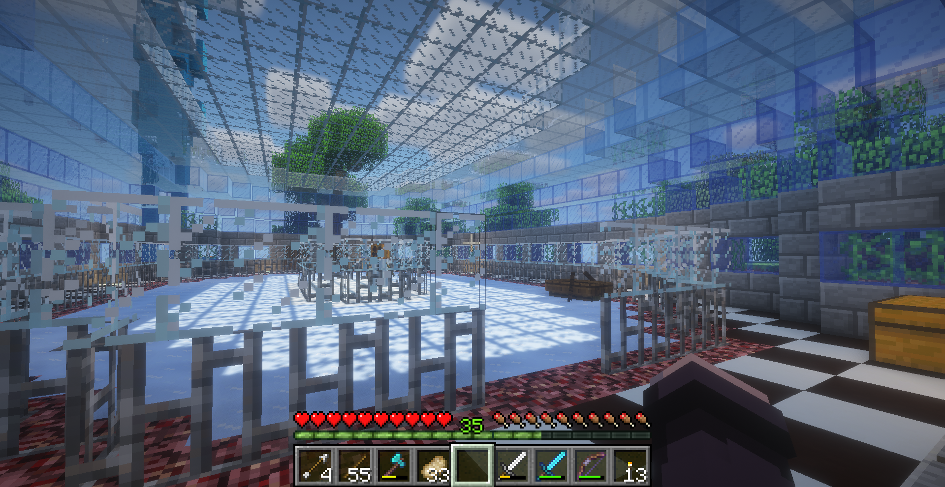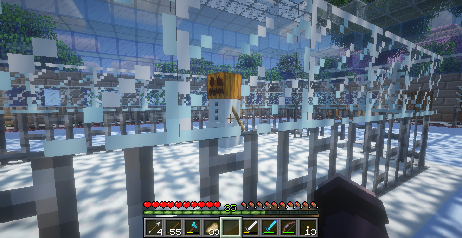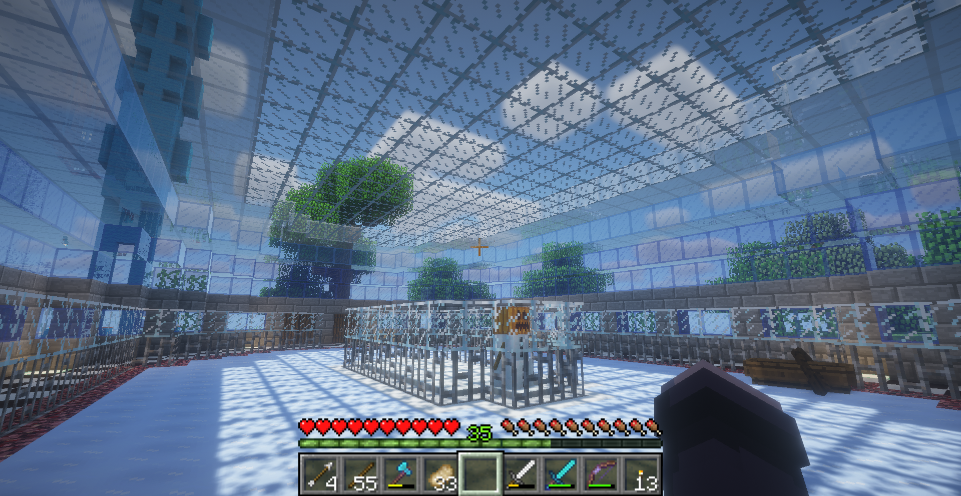 I love this build! It features a ring of ice and a couple chests full of boats that can be used to zip and slip around the ice. It's very light and bright, with the roof being made of glass. There's even a snowman inside!